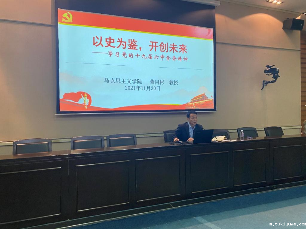 董同彬教授以三次会议与三个历史决议作为前言概述了三次决议的形成背景,深刻阐述了六中全会的一个主题、两个确立、三次飞跃、四个阶段四大成就四大飞跃、五点意义、十条历史经验十个坚持。辅导报告主题鲜明、解析精准、内容充实、讲解详实,对于帮助广大党员、教职员工全面准确理解和更好贯彻落实党的十九届六中全会精神具有重要促进作用。